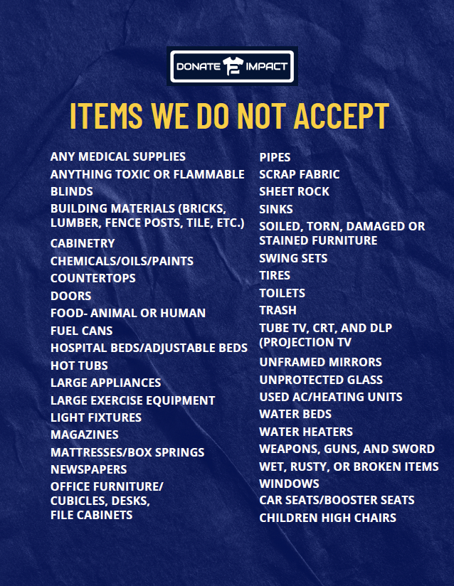 For your convenience, please review our detailed list of Unacceptable Items to ensure your donations meet the requirements before dropping off at or calling to schedule a home pickup.